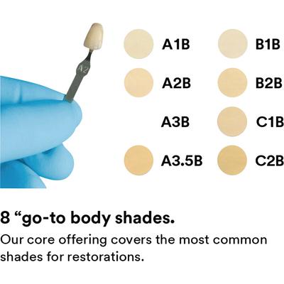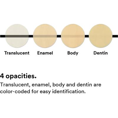 Available in 36 shades across four opacities—body, dentin, enamel, and translucent—aligned to the VITA® Classical Shade Guide for easy color matching. -