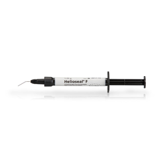 Helioseal F is a light-curing, white-shaded fissure sealant featuring fluoride release. Fluoride is known to increase enamel resistance via the promotion of remineralization and inhibition of demineralization; reduce plaque growth and plaque activity; and have a bacteriotoxic effect. The ergonomic syringe is comfortable to hold and allows the material to be dispensed and placed precisely.