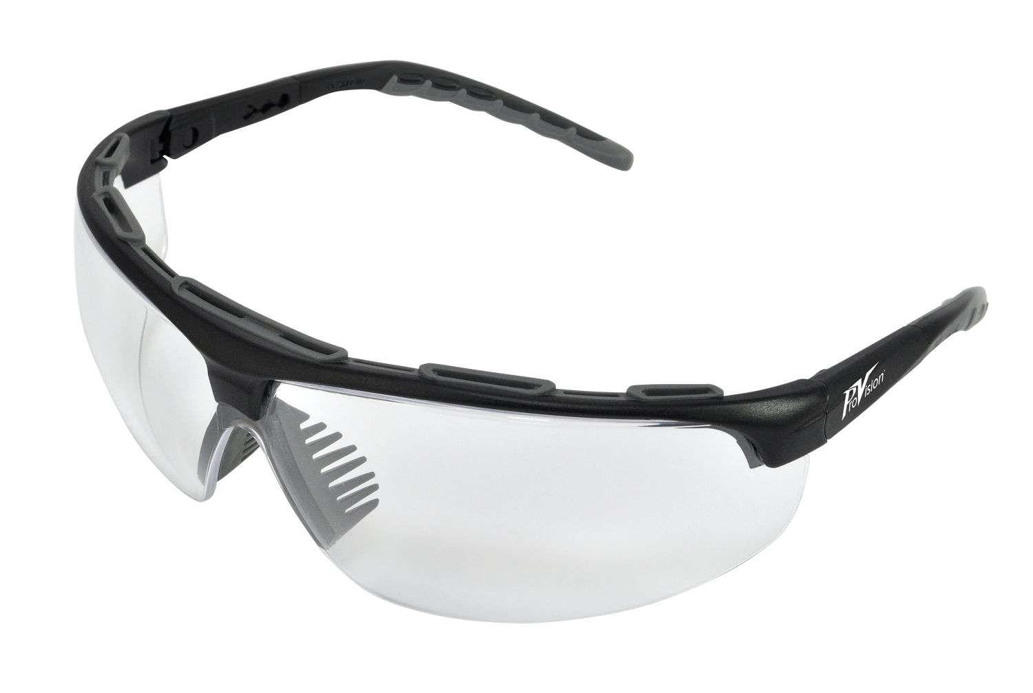 Upscale black frame and clear wraparound lens with anti-fog and antistatic features